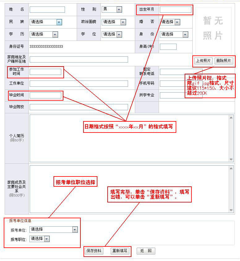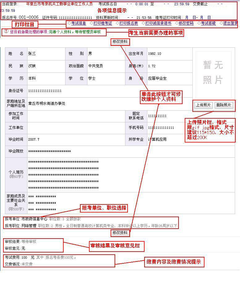5、考生信息輸入完畢,單擊“保存資料”按鈕后即可將個(gè)人資料保存。此時(shí)考生可等待資格初審,資格審核結(jié)果和審核意見將在考生個(gè)人信息界面中顯示,具體提示信息顯示的位置及說明見下圖: