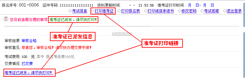 7、準(zhǔn)考證派發(fā)后,顯示如下信息,此時(shí)打印準(zhǔn)考證,等待考試。