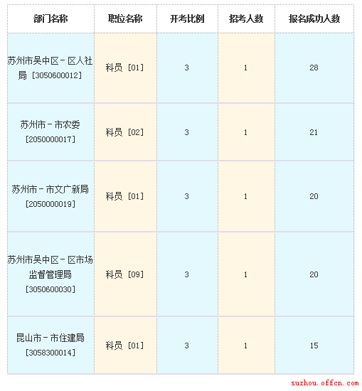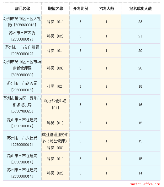 截至12日16時(shí),蘇州市報(bào)名人數(shù)最多的職位為:蘇州市吳中區(qū)-區(qū)人社局科員 [01],一共有28人報(bào)名,競爭最激烈的職位也是蘇州市吳中區(qū)-區(qū)人社局科員 [01],招錄1人,報(bào)名人數(shù)為28人,報(bào)名通過審核人數(shù)前十的職位主要集中在蘇州市吳中區(qū)-區(qū)人社局 [3050600012]、蘇州市市農(nóng)委[2050000017]和市文廣新局[2050000019]、吳中區(qū)市場監(jiān)督管理局[3050600030]、相城地稅局[5050700026]等部門,具體信息如下: