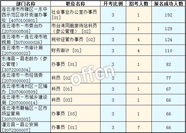 截至16日16時,連云港市報名人數(shù)最多的職位為:社會事業(yè)辦公室辦事員 [01],一共有89人報名,同時也是競爭最激烈的職位,報名通過審核人數(shù)前十的職位主要集中在連云港市市轄區(qū)-東中西示范區(qū)徐圩街道辦事處 [4070100801]、連云港市-市委臺辦 [2070000508],具體信息如下: