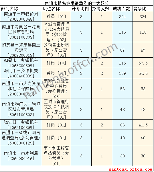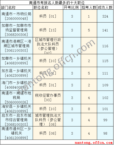 截至16日16時(shí),南通市報(bào)名人數(shù)最多的職位為:科員 [01],一共有324人報(bào)名,競爭最激烈的職位為也是這個(gè)報(bào)名最多的科員[01],招錄1人,報(bào)名人數(shù)為324人,報(bào)名通過審核人數(shù)前十的職位比較集中,主要是南通市區(qū)和縣區(qū)鄉(xiāng)鎮(zhèn)機(jī)關(guān),如南通市-市物價(jià)局[2060000048]、如皋市-鄉(xiāng)鎮(zhèn)機(jī)關(guān)[4068200899],具體信息如下: