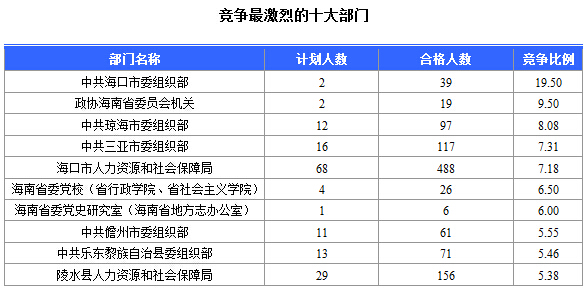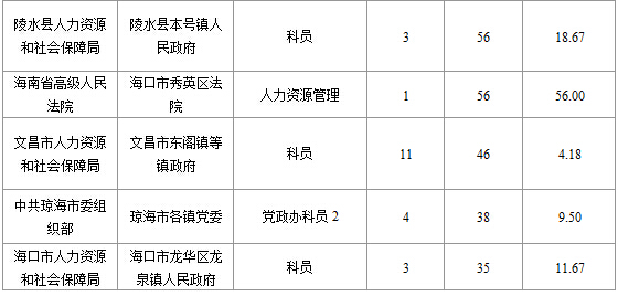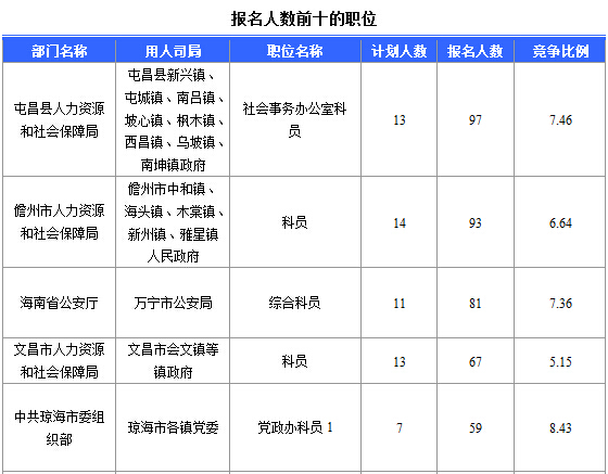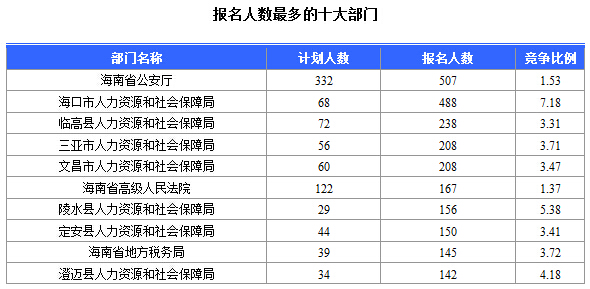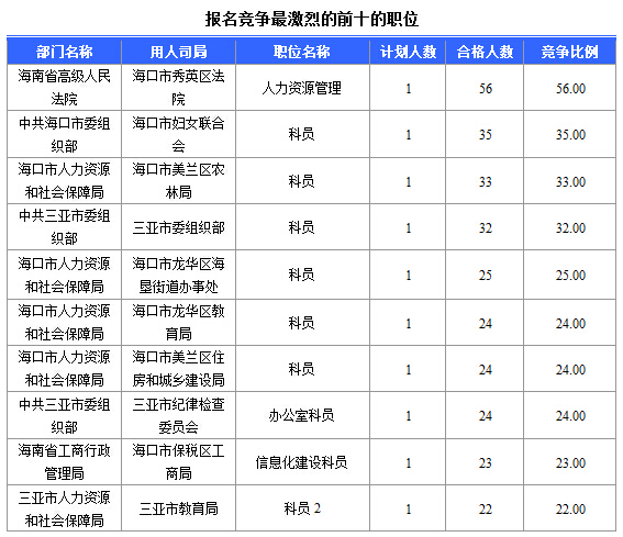 報(bào)名通過(guò)審核人數(shù)前十的職位主要集中在海南省高級(jí)人民法院、海口市人力資源和社會(huì)局、海南省林業(yè)廳,具體信息如下: