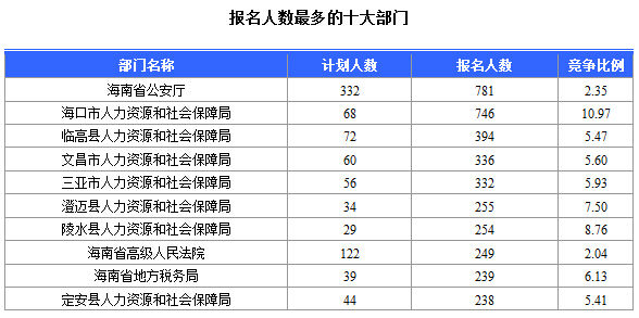截至15日16時(shí),報(bào)名人數(shù)前三位的部門依次是:海南省公安廳、??谑腥肆Y源和社會(huì)局、臨高縣人力資源和社會(huì)局,三部門報(bào)名總?cè)藬?shù)達(dá)1921人,占報(bào)名總?cè)藬?shù)的26.1%。