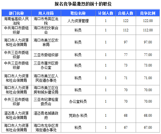 截止16日16時(shí),招錄比例的職位為海南省高級(jí)人民法院海口市秀英區(qū)法院人力資源管理一職,招錄1人,截止16日16時(shí)通過(guò)人數(shù)為122人。