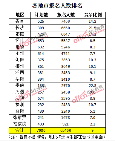 為幫助廣大考生更清晰的了解報(bào)名情況,中公網(wǎng)校整理了各地市職位的報(bào)名人數(shù)排名以及競(jìng)爭(zhēng)比例排名,供廣大考生參考:
