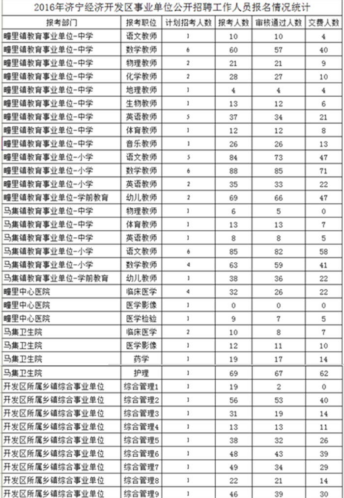 原標題:2016年濟寧經(jīng)濟開發(fā)區(qū)事業(yè)單位公開招聘工作人員報名情況