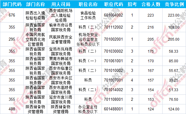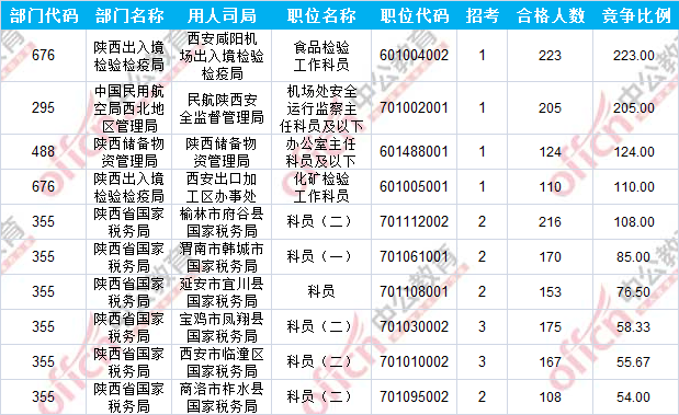 報(bào)名通過(guò)審核人數(shù)前十的職位主要集中在陜西出入境檢驗(yàn)檢疫局、陜西省國(guó)家稅務(wù)局、中國(guó)民用航空局西北地區(qū)管理局等部門(mén),具體信息如下: