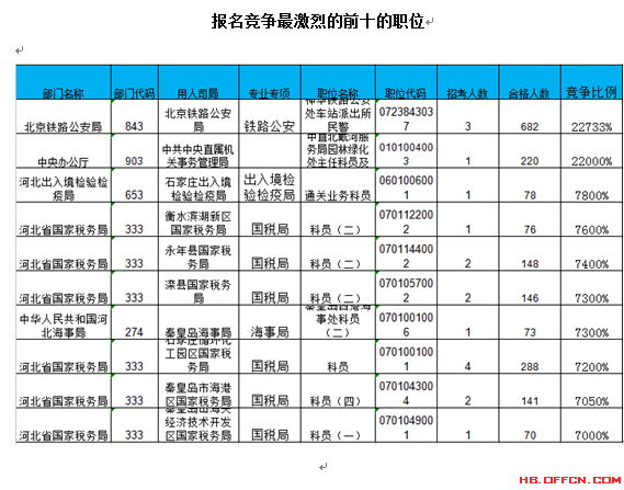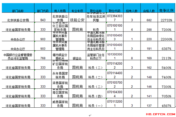 報名通過審核人數(shù)前十的職位主要集中在北京鐵路公安局、河北省國家稅務(wù)局、中央辦公廳等部門,具體信息如下: