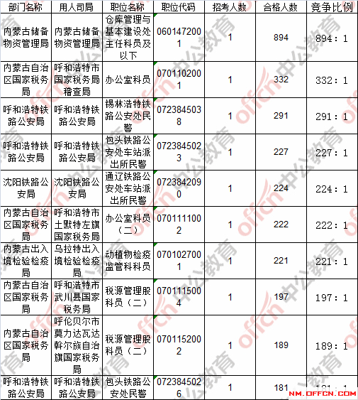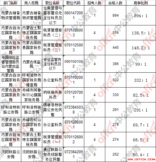 報名通過審核人數(shù)前十的職位主要集中在內(nèi)蒙古儲備物資管理局、內(nèi)蒙古固陽縣國家稅務(wù)局、內(nèi)蒙古土默特右旗國家稅務(wù)局等部門,具體信息如下:
