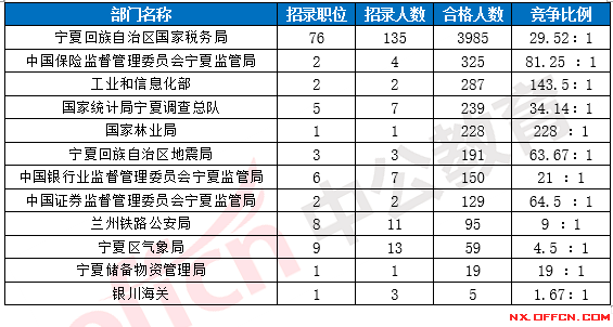 截至23日8時,據(jù)寧夏中公網(wǎng)校統(tǒng)計,2017國考招錄職位中工作地點在寧夏的職位審核合格總?cè)藬?shù)為5712人,所有職位均有人報考,其中5職位競爭比低于面試比例,平均競爭比例為35.22:1 。
