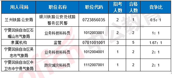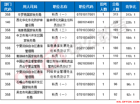 合格人數(shù)前十的職位主要集中在寧夏回族自治區(qū)國家稅務局、中國保險監(jiān)督管理委員會寧夏監(jiān)管局、國家林業(yè)局等部門,具體信息如下:
