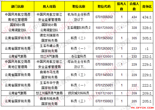 截止23日8時(shí),招錄比例的職位為中國(guó)民用航空麗江安全監(jiān)督管理局_機(jī)場(chǎng)處主任科員及以下,職位代碼是0701006002,招錄1人,通過(guò)人數(shù)434人,競(jìng)爭(zhēng)比434:1