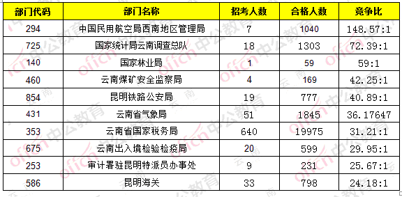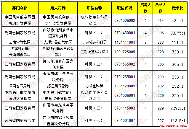 報(bào)名通過(guò)審核人數(shù)前十的職位主要集中在中國(guó)民用航空局西南地區(qū)管理局、云南省國(guó)家稅務(wù)局、云南省氣象局等,具體信息如下: