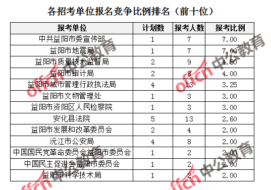 競爭熱門招考單位,前三位依次是:中共益陽市委宣傳部(競爭比例7:1)和益陽市地震局(競爭比例7 :1)、益陽市質(zhì)量技術(shù)監(jiān)督局(競爭比例4.5:1)、益陽市審計(jì)局(競爭比例4:1)。