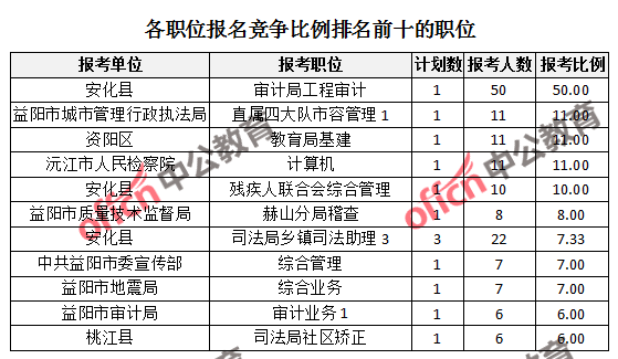 競爭熱門職位,前三位依次是:安化縣審計(jì)局工程審計(jì)(競爭比例50:1)、益陽市城市管理行政執(zhí)法局直屬四大隊(duì)市容管理1(競爭比例11:1)和資陽區(qū)教育局基建(競爭比例11:1)以及沅江市人民檢察院計(jì)算機(jī)(競爭比例11:1)、安化縣殘疾人聯(lián)合會綜合管理(競爭比例10:1)。