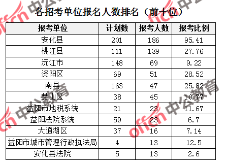 為幫助廣大考生更清晰的了解報(bào)名情況,中公教育整理了益陽市各招考單位的報(bào)名人數(shù)排名以及競爭比例排名,供廣大考生參考: