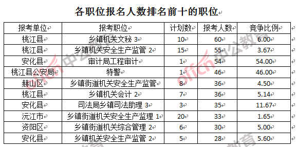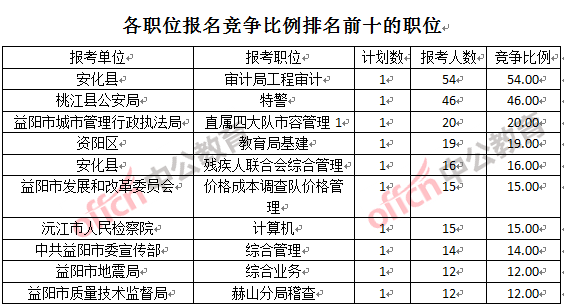 競爭熱門職位,前三位依次是:安化縣審計局工程審計(競爭比例54:1)、桃江縣公安局特警(競爭比例46:1)、益陽市城市管理行政執(zhí)法局直屬四大隊市容管理1(競爭比例20:1)