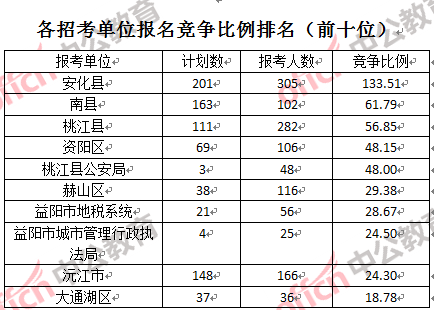 競(jìng)爭(zhēng)熱門招考單位,前三位依次是:安化縣 (競(jìng)爭(zhēng)比例133.5:1)、南縣(競(jìng)爭(zhēng)比例61.3:1)和桃江縣(競(jìng)爭(zhēng)比例56.8:1)。