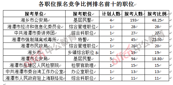 競(jìng)爭(zhēng)最熱門(mén)職位,前三位依次是:湘鄉(xiāng)市公安局基層民警(競(jìng)爭(zhēng)比例48.25:1)、湘潭市經(jīng)濟(jì)和信息化委員會(huì)綜合管理職位(競(jìng)爭(zhēng)比例28:1)和中共湘潭市委團(tuán)綜合科職位(競(jìng)爭(zhēng)比例27:1)。