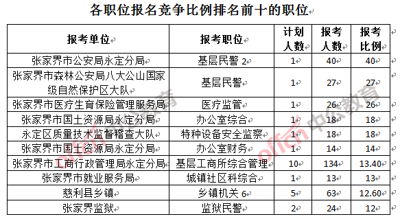 為幫助廣大考生更清晰的了解報(bào)名情況,中公教育整理了張家界市各職位的報(bào)名人數(shù)排名以及競(jìng)爭(zhēng)比例排名,供廣大考生參考: