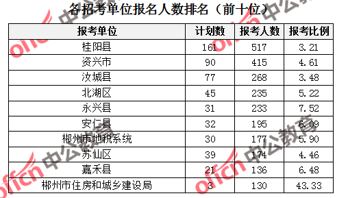 為幫助廣大考生更清晰的了解報名情況,中公教育整理了郴州市各招考單位的報名人數(shù)排名以及競爭比例排名,供廣大考生參考: