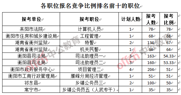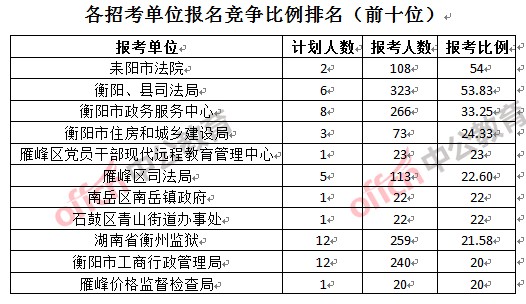 競(jìng)爭(zhēng)熱門招考單位,前三位依次是:耒陽(yáng)市法院(競(jìng)爭(zhēng)比例54:1)、衡陽(yáng)縣司法局(競(jìng)爭(zhēng)比例53.83:1)和衡陽(yáng)市政務(wù)服務(wù)中心(競(jìng)爭(zhēng)比例33.25:1)。