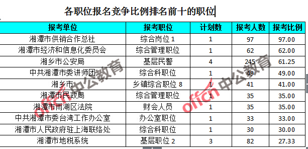 競(jìng)爭(zhēng)熱門(mén)職位,前三位依次是:湘潭市供銷(xiāo)合作總社綜合崗位1(競(jìng)爭(zhēng)比例97:1)、湘潭市經(jīng)濟(jì)和信息化委員會(huì)綜合管理職位(競(jìng)爭(zhēng)比例62:1)和湘鄉(xiāng)市公安局基層民警(競(jìng)爭(zhēng)比例61.25:1)。