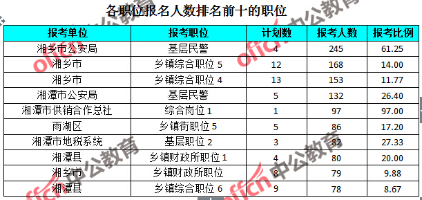 為幫助廣大考生更清晰的了解報(bào)名情況,中公網(wǎng)校整理了湘潭市各職位的報(bào)名人數(shù)排名以及競(jìng)爭(zhēng)比例排名,供廣大考生參考: