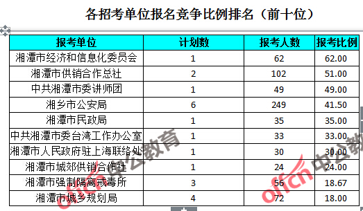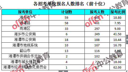 為幫助廣大考生更清晰的了解報(bào)名情況,中公網(wǎng)校整理了湘潭市各招考單位的報(bào)名人數(shù)排名以及競(jìng)爭(zhēng)比例排名,供廣大考生參考: