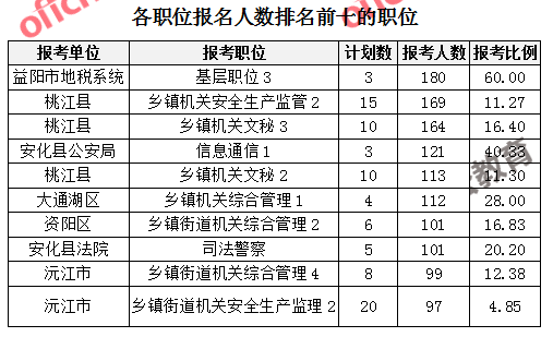 為幫助廣大考生更清晰的了解報名情況,中公網(wǎng)校整理了益陽市各職位的報名人數(shù)排名以及競爭比例排名,供廣大考生參考: