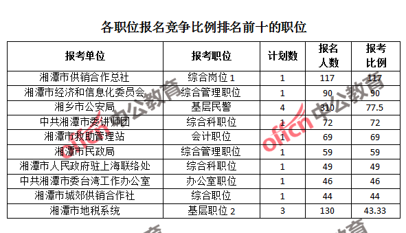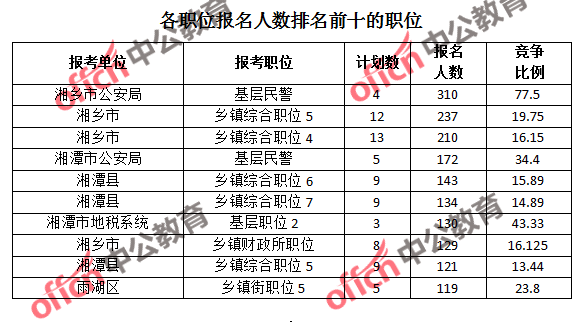 為幫助廣大考生更清晰的了解報名情況,中公網(wǎng)校整理了湘潭市各職位的報名人數(shù)排名以及競爭比例排名,供廣大考生參考: