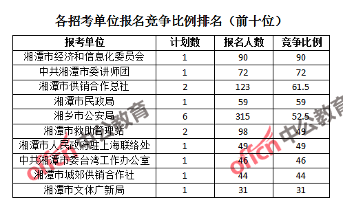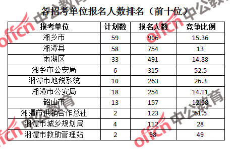 為幫助廣大考生更清晰的了解報名情況,中公網(wǎng)校整理了湘潭市各招考單位的報名人數(shù)排名以及競爭比例排名,供廣大考生參考: