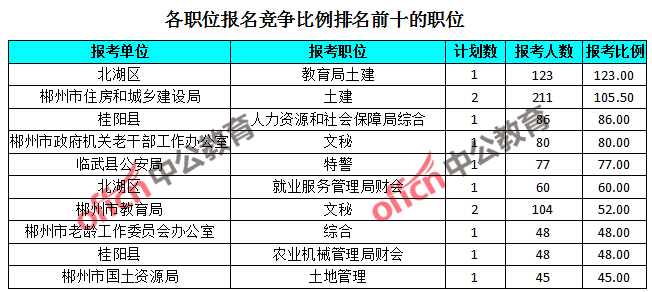 競爭熱門職位,前三位依次是:北湖區(qū)教育局土建(競爭比例123:1)、郴州市住房和城鄉(xiāng)建設(shè)局土建(競爭比例105.5:1)和桂陽縣人力資源和社會局綜合(競爭比例86:1)。
