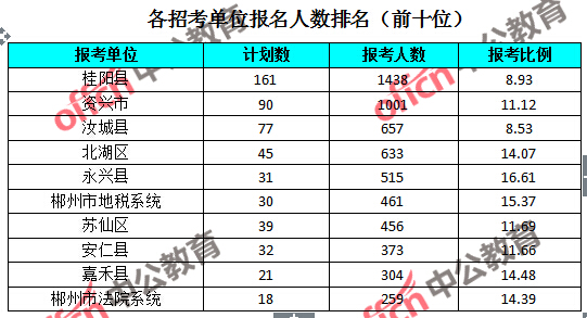 為幫助廣大考生更清晰的了解報名情況,中公網(wǎng)校整理了湖南郴州各招考單位的報名人數(shù)排名以及競爭比例排名,供廣大考生參考: