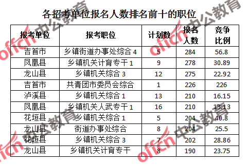 截止27日17時(shí),2017年湘西公務(wù)員報(bào)名人數(shù)最多的前三個(gè)職位為吉首市鄉(xiāng)鎮(zhèn)街道辦事處綜合4(284人報(bào)名)、鳳凰縣鄉(xiāng)鎮(zhèn)機(jī)關(guān)計(jì)育專干1(278人報(bào)名)和龍山縣鄉(xiāng)鎮(zhèn)機(jī)關(guān)綜合3(275人報(bào)名)。
