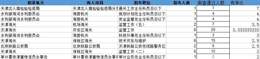 截止到30日18時,競爭比例的職位為天津出入境檢驗(yàn)檢疫局的工作主任科員及以下,招錄1人,截止到30日18時通過人數(shù)為7人。