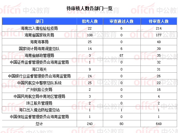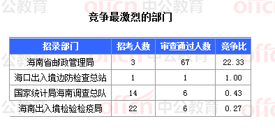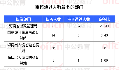 截止到30日18時,通過審核人數(shù)前三位的部門依次是:海南省郵政管理局、國家統(tǒng)計局海南調(diào)查總隊、海南出入境檢驗檢疫局,三部門通過審核總?cè)藬?shù)達79人,占通過審核總?cè)藬?shù)的98.75%。