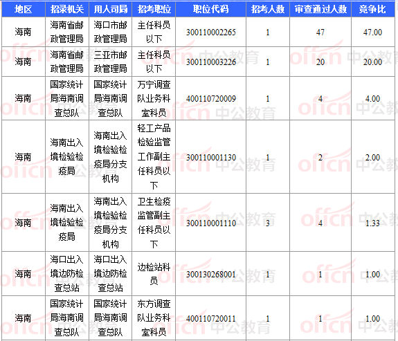 報(bào)名通過審核人數(shù)前十的職位主要集中在海南省郵政管理局、國家統(tǒng)計(jì)局海南調(diào)查總隊(duì)、海南出入境檢驗(yàn)檢疫局等部門,具體信息如下: