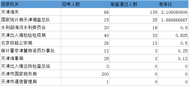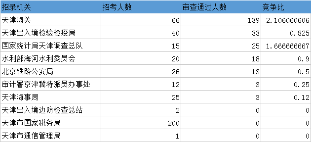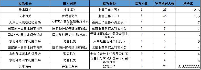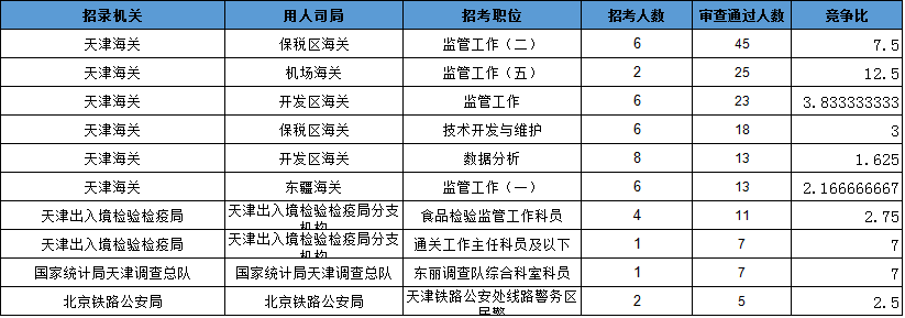 報名通過審核人數(shù)前十的職位主要集中在天津海關(guān)、天津出入境檢驗(yàn)檢疫局等部門,具體信息如下: