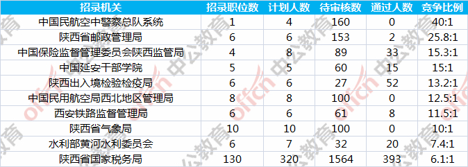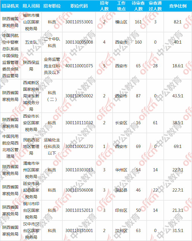 報(bào)名人數(shù)前十的職位主要集中在陜西省國(guó)家稅務(wù)局、中國(guó)民航空中警察總隊(duì)系統(tǒng)、中國(guó)保險(xiǎn)監(jiān)督管理委員會(huì)陜西監(jiān)管局等部門,具體信息如下: