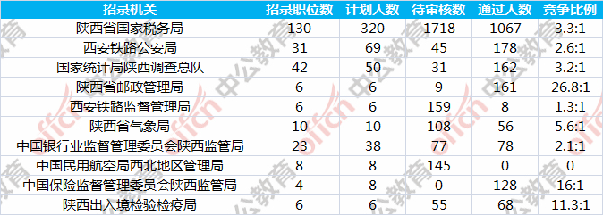 截至到31日18時(shí),通過審核人數(shù)前三位的部門依次是:陜西省國(guó)家稅務(wù)局、西安鐵路公安局、國(guó)家統(tǒng)計(jì)局陜西調(diào)查總隊(duì),三部門通過審核總?cè)藬?shù)達(dá)1407人,占通過審核總?cè)藬?shù)的71.06%。