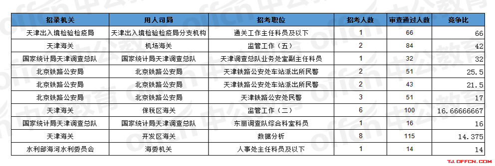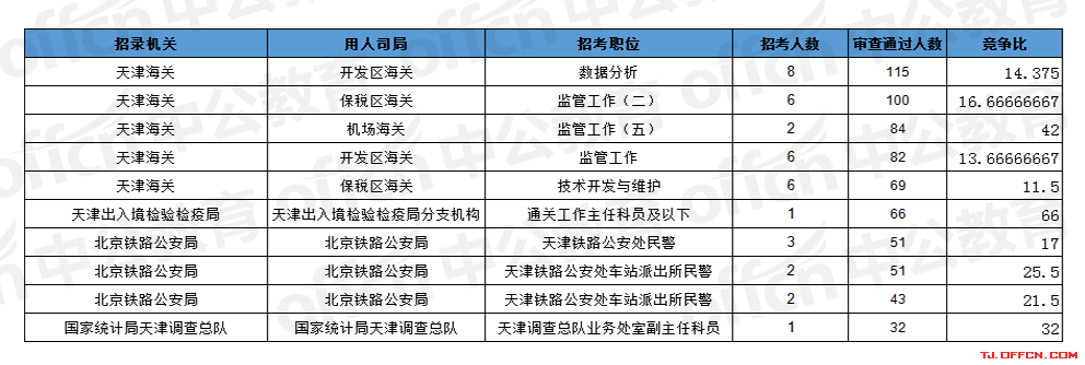 報(bào)名通過審核人數(shù)前十的職位主要集中在天津海關(guān)、北京鐵路公安局、天津出入境檢驗(yàn)檢疫局等部門,具體信息如下: