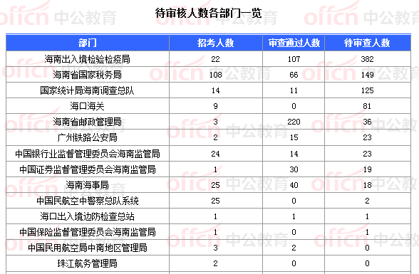 截止到31日18時(shí),通過審核人數(shù)前三位的部門依次是:海南省郵政管理局、海南出入境檢驗(yàn)檢疫局、海南省國(guó)家稅務(wù)局,三部門通過審核總?cè)藬?shù)達(dá)393人,占通過審核總?cè)藬?shù)的77.67%。