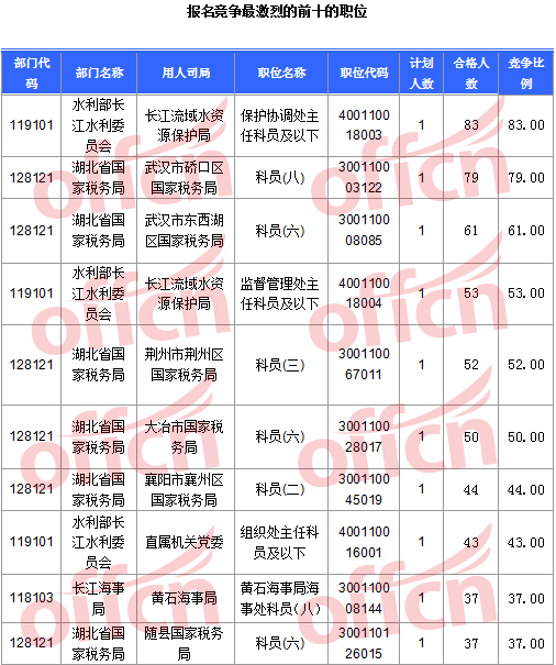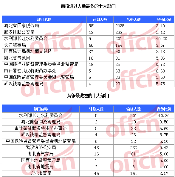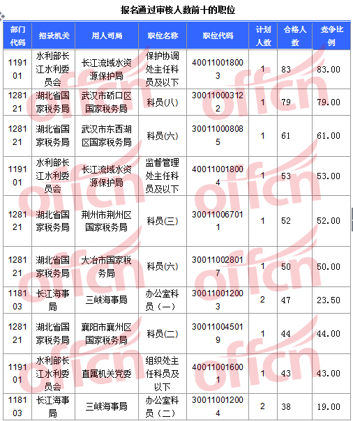 報名通過審核人數前十的職位主要集中在水利部長江水利委員會、湖北省國家稅務局、長江海事局等部門,具體信息如下: