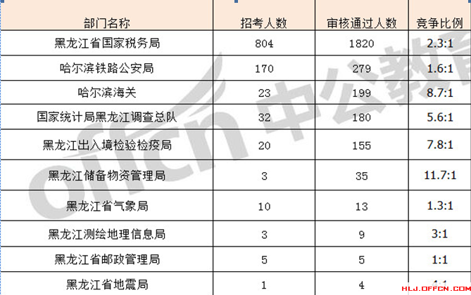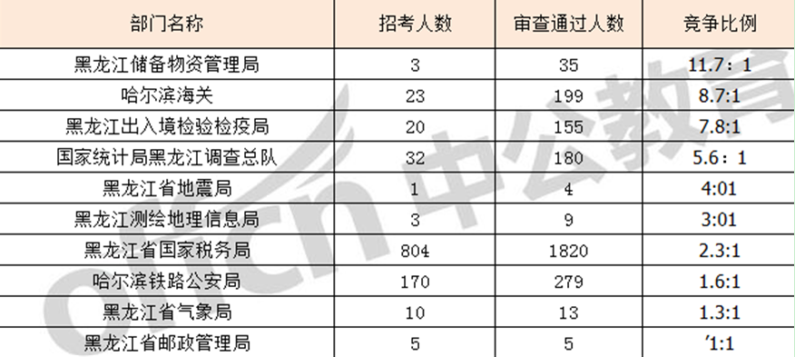 報名通過審核人數(shù)前十的職位主要集中在黑龍江省國家稅務(wù)局、國家統(tǒng)計局黑龍江調(diào)查、黑龍江出入境檢驗檢疫局等部門。