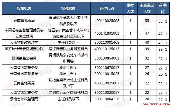 截止10月31日18時(shí),國考報(bào)名第二天,國家統(tǒng)計(jì)局云南調(diào)查總隊(duì),部門代碼:152125,直屬機(jī)關(guān)黨委辦公室主任科員及以下崗位,職位代碼:400110025008,招錄1人,審查通過人數(shù)為55人,具體信息如下: