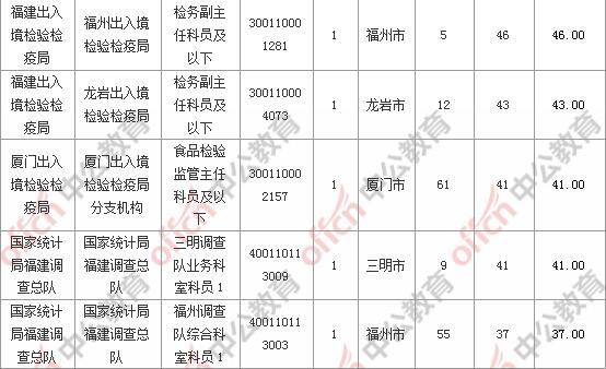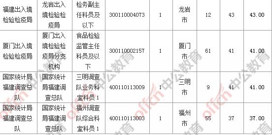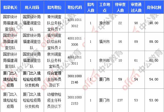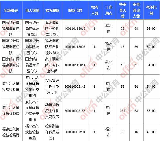 報名通過審核人數(shù)前十的職位主要集中在國家統(tǒng)計局福建調(diào)查總隊、廈門出入境檢驗檢疫局、福建出入境檢驗檢疫局等部門,具體信息如下: