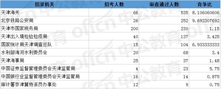 截止到1日09時,通過審核人數(shù)前三位的部門依次是:天津海關、北京鐵路公安局、天津市國家稅務局,三部門通過審核總人數(shù)達1017人。