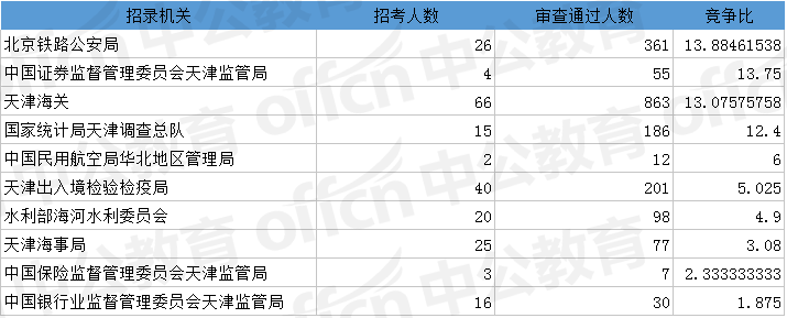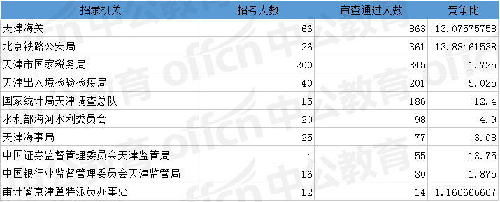 為幫助廣大考生更清晰的了解今日報名情況,中公網(wǎng)校整理了審核通過人數(shù)前十位的部門以及競爭比例最激烈的十大部門,供廣大考生參考:
