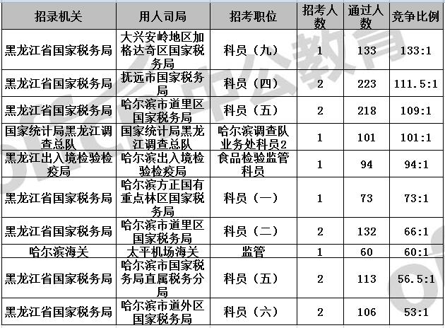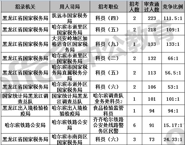 報名通過審核人數(shù)前十的職位主要集中在黑龍江省國家稅務局、國家統(tǒng)計局黑龍江調(diào)查總隊、黑龍江出入境檢驗檢疫局等部門,具體信息如下: